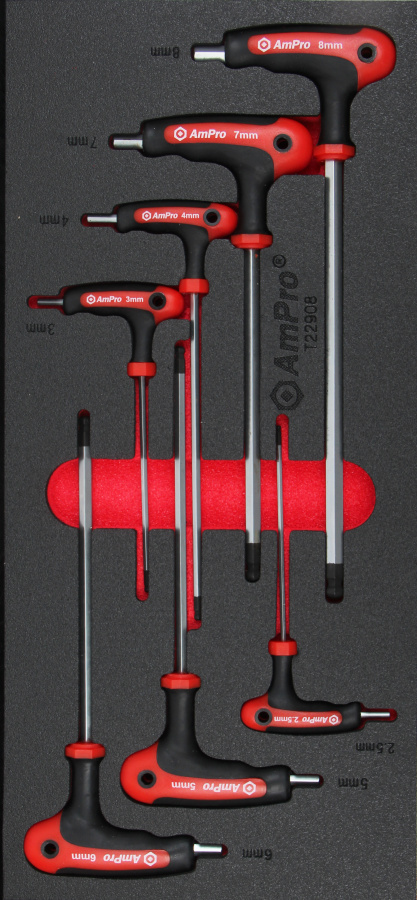 Приобрести T22908 Набор 6-гр. отверток с Т-обр. ручкой с шаром 2,5-8мм, 7пр.,в мягком ложементе от компании AmPro (Тайвань) из раздела Ложементы мягкие (VA серия)